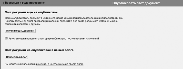 При публикации документ получает постоянный адрес на серверах Google, и теперь кто угодно сможет без каких-либо препятствий ознакомиться с вашим текстом, будь то чудесный фантастический рассказ или отличный бизнес-план – для этого достаточно зайти по URL-адресу, появившемуся у документа при публикации. Установка флажка «Автоматически выполнять повторную публикацию после внесения изменений» позволяет менять вид опубликованной копии одновременно с редактированием оригинала – так читатели смогут быть в курсе самых последних правок текста. Если же вы предпочитаете публиковать обновления документа только после тщательной вычитки и проверки, то такой флажок устанавливать не нужно – в этом случае свежую версию читатели смогут увидеть лишь после нажатия кнопки «Опубликовать повторно».