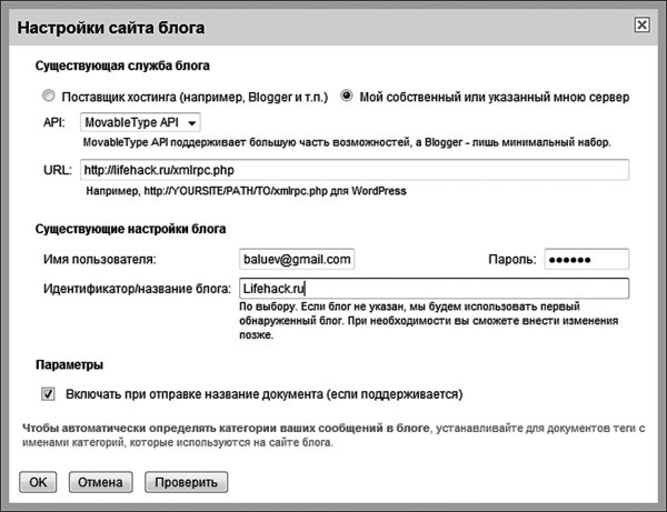 Второй способ публикации документа сложнее и увлекательнее одновременно. Вы ведете блог? Да, тот самый дневник в «Живом журнале», Blogger или, скажем, LiveInternet. А может быть, у вас, как и у меня, отдельно стоящий ресурс на платформе, допустим, Wordpress? Документы Google умеют самостоятельно размещать ваши тексты в виде заметок в блоге. Однако для организации такой связки необходимо произвести несколько настроек. Для этого в пункте «Настройки» (напомню, что он находится в правом верхнем углу основного экрана) необходимо перейти по ссылке «Настройки блога – Изменить информацию». В окне настроек блога следует указать тип платформы, на которой функционирует журнал. Для выбора из списка доступны такие популярные на Западе сервисы, как BlogHarbor.com, BlogWare.com, SquareSpace.com, Wordpress.com, а также весьма успешный у нас Blogger.com и знаменитый LiveJournal. Для тех, чей сервис в список не вошел, а также тех, у кого блог функционирует на отдельном сервере, доступна опция «Мой собственный или указанный мною сервер». В этом случае необходимо будет указать тип API (Application Programming Interface, способ общения сторонних сервисов с блогом), а также адрес вашего ресурса с указанием страницы-шлюза (о ней лучше прочитать в документации к вашей блоговой платформе. Стандартный путь до шлюза на самом популярном блог-движке Wordpress такой: http://название_блога/xmlrpc.php). В качестве примера приведу свой блог: в моих настройках выбран Movable Type API, а в поле «URL» стоит http://www.lifehack.ru/xmlrpc.php (рис. 2.24).