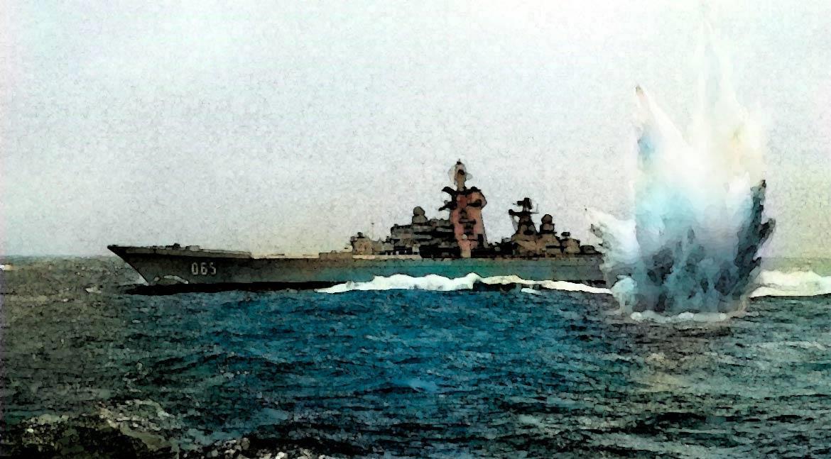 Два «южных» «Гарпуна» уничтожаются зенитным огнем. Один даже красиво взрывается сдетонировавшей таки боевой частью. Но последний влетает в БПК «Адмирал Нахимов» и попадает аккурат в контейнер с «Раструбами», чем вызывает детонацию этих ракет. Корабль кидает сначала на правый борт, потому он начинает валится влево, и всем понятно, что это конец, потому что нос его начинает подниматься вверх. «Нахимов» разломан пополам, и хорошо, если удержится на воде еще хотя бы пару минут.