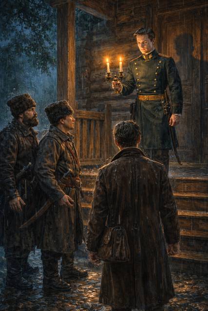 Есаул выставил вперёд медный канделябр с двумя свечами – пламя дрогнуло от сквозняка, бросив на стены длинные, пляшущие тени. Он по очереди осветил лица Петра и Николая, прищурился, вглядываясь в их сбитые костяшки, порванные воротники и влажные от дождя волосы.