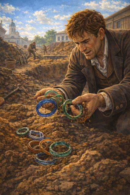 Я тут же погрузил руки в землю, стал набивать карманы стеклянными браслетами, обращая внимание, что цветных, ярко-синих, что должны присутствовать среди прочих, здесь не обнаружено. Наверное, рабочие берут себе такие стекляшки для забавы.