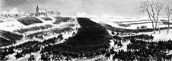 Двадцать четвертого, поутру, Багратион атакован был наступавшим неприятелем. Битва была горячая, но, несмотря на усилия французов, щегольство в порядке сохранено было во всех частях арьергарда. К вечеру он потянулся вслед за армиею, направляясь чрез Толбаш и Кашауен, и прибыл в Бергерсвальд, в трех верстах от Фрауэндорфа, где на несколько часов приостановилась главная армия. В этот день прусский корпус Лестока, шедший на одной высоте с арьергардом нашим по направлению на Вормдит, атакован был корпусом Нея, отряженным исключительно против него от главной французской армии на походе ее из Ян-кова к Вольфсдорфу. В одно и то же время отряжен был от этой же армии и корпус Даву на Гейльсберг; это было сделано в видах облегчения шествия войск по тесной от снегов дороге, причинявшей чрезмерное растягивание маршевой колонне.