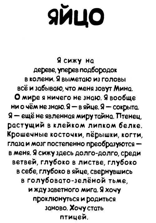 Я пишу и пишу, наверно, уже много часов. В зеленоватом, пятнистом свете. И рука моя в ладу с головой, а в голове мысли и слова, и я среди них брожу, и минута бежит за минутой, а в тайной сердцевине голубовато-зелёных яиц растут новые неведомые существа.