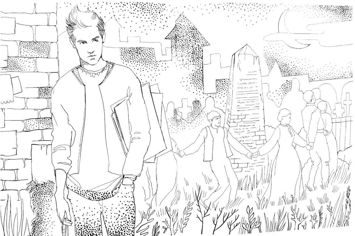 За ночь пустырь успел побелеть, подернуться инеем. Я бросил взгляд за окно, мимо удрученного завуча: Эскью был там, темный силуэт на фоне белой земли. Он шел вдали, тяжело ступая сквозь плотный туман. Теплое пальто, черная вязаная шапка надвинута на глаза, а под мышкой – альбом для набросков. Рядом семенит верный пес Джакс.