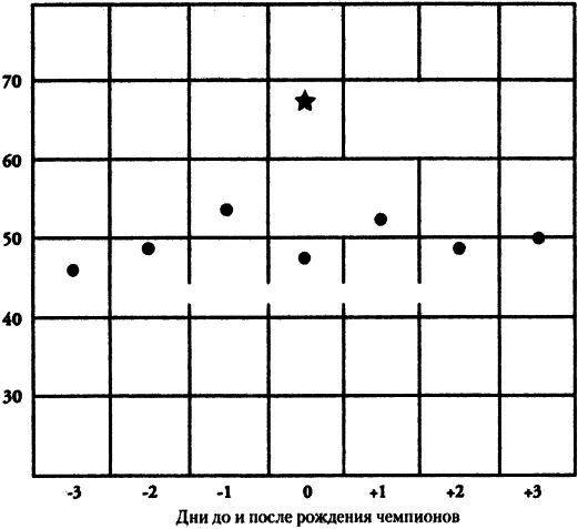 Эффект Марса, конечно, привлек серьезное внимание астрологов, да и скептиков тоже. В конце 60-х годов и все 70-е годы XX века все говорили об открытии Гоклена; случались дискуссии и позже, в 80-е и 90-е [173]. Редакторы Humanistсделали вывод, и вполне логичный, что Гоклен был необъективен в отборе фактологического материала – брал то, что вписывалось в его теории. Он всех вежливо выслушивал, кому-то отвечал, прочих игнорировал. Тогда в полемику включился статистик Марвин Целен, в то время заведовавший кафедрой биостатистики в Гарвардском университете. Он должен был обеспечить объективный подход к проблеме. Честно следуя рекомендациям Целена, Гоклен опросил 16 756 мужчин и женщин, родившихся в течение трех дней и примерно в том районе, где и 303 спортсмена-чемпиона. Гоклен надеялся показать, что воздействие Марса – это не просто статистическая подтасовка или аномалия. Хотя Гоклен проводил исследование самостоятельно, Марвин Целен официально одобрил результаты. В самом деле, диаграмма, эти результаты представляющая, поражает.