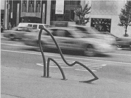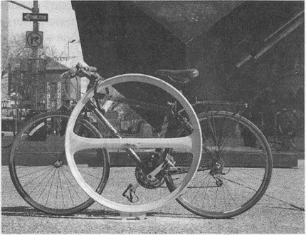 Из-за своей уникальности эти стойки-держатели не могли служить решением проблемы с парковкой велотранспорта. Зато они привлекли кое-какое внимание. Несколько месяцев спустя был назван настоящий победитель конкурса – изящный и практичный дизайн в форме колеса (см. следующее фото).