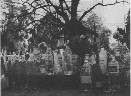 На следующий день, ближе к вечеру, я направляюсь на своем велосипеде в парк, когда замечаю вдруг маленькое «святилище», состоящее из скромных размеров статуи святого и стоящих вокруг нее подношений в виде пластиковых бутылочек с водой. Их сотни, они занимают немало места. С первого взгляда, если не знаешь, что это такое, можно подумать, будто перед тобой нечто вроде пункта приема пластиковой тары. Но, присмотревшись, замечаешь безошибочные признаки обдуманного, сосредоточенного, но непонятного акта человеческой воли. Бутылочки не разбросаны как попало, все они подчинены какой-то единой цели. Эти простые предметы выстроены в определенном порядке, они получили силу и назначение, они заряжены людскими надеждами и стремлениями. Даже неверующий может ощутить духовную и творческую силу произошедшего здесь действа. Общее движение воли сотен людей – изнутри наружу. Сделав несколько снимков, я качу своей дорогой.