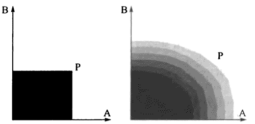 Мы можем обобщить это с помощью схематической диаграммы (рис. 2.1), показывающей, как высокоуровневое свойство Р могло бы зависеть от двух низкоуровневых параметров А и В, каждый из которых может принимать множество значений. Если бы у нас имелось четкое определение в терминах необходимых и достаточных условий, то ситуация напоминала бы картину слева, где черный прямоугольник изображает область реализации свойства Р. Зависимость, однако, неизменно напоминает картину справа с размытыми границами и большим участком, в котором вопрос о наличии свойства Р остается неопределенным, – при наличии, однако же, и участка, где этот вопрос определен. (Неопределенным, возможно, является, живы ли бактерии и компьютерные вирусы, но нет сомнений, что собаки – это живые существа.) При наличии примера, взятого из второго участка, реализующего А и В в степени, достаточной для реализации Р, кондиционал «если х есть А и В в этой степени, то х есть Р» оказывается концептуальной истиной, несмотря на отсутствие четкой дефиниции Р. Любая неопределенность в таких кондиционалах, в серых участках, будет отражать фактуальную неопределенность, как и должно быть. Эту картину можно напрямую расширить до зависимости свойства от любого множества факторов и до супервентностных кондиционалов в целом.