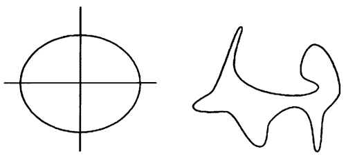 Важно, таким образом, что одно множество фактов может влечь за собой другое множество и при отсутствии четкого определения понятий второго множества в терминах первого. Указанный выше случай может быть примером этого: не существует простой дефиниции Р в терминах А и В, но факты относительно А и В сразу влекут за собой факты о Р. В качестве другого примера возьмем округлость замкнутых кривых в двумерном пространстве (рис. 2.2). Округлость наверняка нельзя точно определить в терминах более простых математических понятий. Тем не менее посмотрим на фигуру слева, характеризуемую уравнением 2х2 + 3 у2 = 1. В той мере, в какой округлость вообще фактуальна, фактом является то, что эта фигура округла (сравним с фигурой справа, которая уж точно не округла). Более того, этот факт вытекает из базовой характеристики данной фигуры в математических терминах – наличие этой характеристики и понятия округлости определяют факт округлости данной фигуры. Принимая во внимание, что А – факты могут влечь за собой В-факты без определения В-фактов в терминах A-фактов, можно заключить, что понятие логической супервентности не затрагивается отсутствием дефиниций. (Полезно помнить об этом примере, размышляя о более сложных проблемах и возражениях, связанных с логической супервентностью.)
