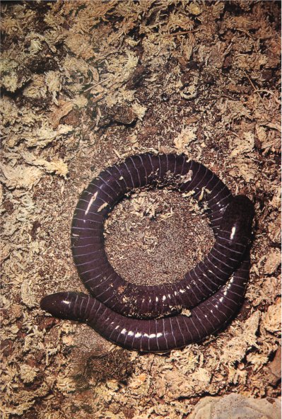 Одна группа таких животных полностью утратила конечности и ведет роющий образ жизни. Строение их настолько своеобразно и так сильно отличается от строения хвостатых земноводных, что их выделяют в отдельный отряд: червяги. Они водятся только в теплых странах, преимущественно в тропиках. У них нет не только ног, но и каких-либо внутренних признаков костного плечевого и тазового пояса. Тело у них очень удлинено. У хвостатых земноводных обычно около десяти спинных позвонков; у червяг их бывает до 270. От глаз им при подземном образе жизни проку мало, часто у них глаза вообще затянуты кожей. Взамен зрения у некоторых видов образовались в месте сочленения челюстей небольшие вытягивающиеся чувствительные щупальца, которые служат им главным органом восприятия. Червяги встречаются редко, так как живут под землей и днем почти никогда не выходят наружу. А если случайно и попадутся на лопату, то их легко принять за ярко окрашенных дождевых червей. Только в отличие от дождевых червей, питающихся гниющими растительными остатками, червяги плотоядны. У них челюсти хищников, и если возьмешь такого «безвредного» червяка в руки, а он вдруг разинет свирепую пасть, пожалуй что, и испугаешься.