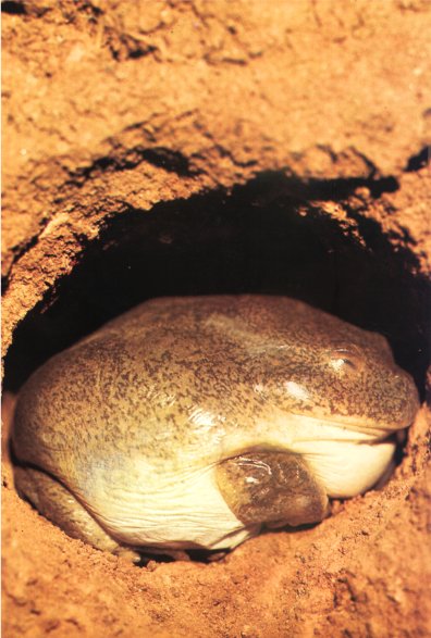Казалось бы, трудно вообразить менее подходящее обиталище для земноводных, чем пустыни центральной Австралии, где дожди не выпадают иногда по нескольку лет кряду. Но некоторые виды лягушек умудряются жить и здесь. Лягушка-водонос, Cyclorana, появляется на поверхности почвы только в пору коротких и редких грозовых ливней. В это время вода скапливается лужами на камнях и стоит день-два, а бывает, что и неделю. Лягушки с лихорадочной поспешностью наедаются насекомыми – те тоже появляются в изобилии вместе с дождем – и тут же спариваются, откладывая икру в мелкие теплые лужи. Головастики выводятся и развиваются с рекордной быстротой. Между тем вода уходит в землю, и пустыня опять высыхает, но за это время все лягушки, и взрослые, и молодь, успевают впитать воду через кожу, наливаются и раздуваются, как шары. Они зарываются в еще не спекшийся песок и устраивают себе на глубине маленькие норки. Из кожи у них выделяется и застывает в виде пленки особое влагонепроницаемое вещество, и они лежат в своих ямках, словно апельсины в пластиковой обертке. Таким образом вода через кожу у них совершенно не испаряется, хотя некоторое количество влаги неизбежно теряется при дыхании – лягушки дышат ноздрями через специальные канальцы в пленке. В таком состоянии остановившейся жизнедеятельности лягушки могут просуществовать года два, а то и больше, очень напоминая этим далекого предка амфибий – протоптера.