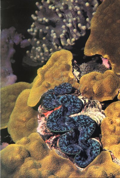 Гигантская тридакна с открытой мантией среди кораллов (Большой Барьерный Риф)