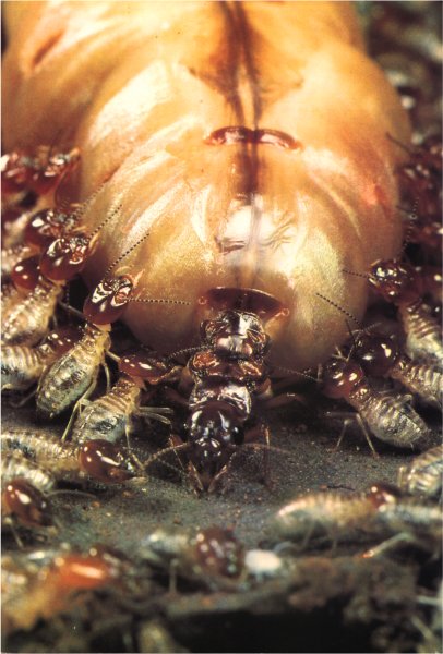 Все эти особи связаны между собой в единый суперорганизм превосходной системой коммуникаций. Термиты-солдаты подают сигнал тревоги, колотя тяжелыми жесткими головами по стенам. Рабочие, наткнувшись на новый источник пищи, метят след запахом, по которому легко находят дорогу их слепые товарищи. Но самый главный и общий механизм общения основан на действии химических веществ, так называемых феромонов. Они разносят приказы по колонии с огромной быстротой. Все члены колонии постоянно обмениваются друг с другом пищей и слюной. Рабочие передают куски изо рта в рот или же подбирают экскременты друг друга, чтобы еще раз переварить недопереваренную пищу и извлечь из нее до последней крохи все питательные вещества. Они же кормят личинок и солдат. И они же ухаживают за царицей, постоянно облизывая ее содрогающиеся бока и подбирая капли влаги у нее из анального отверстия. При этом они получают выделяемые ею феромоны и немедленно разносят их по всей колонии. Личинки являются потенциальными самцами или самками, но феромоны царицы, которые они получают от рабочих с пищей, подавляют их развитие, и молодые термиты вырастают бесплодными, слепыми и бескрылыми. Солдаты тоже вырабатывают свой феромон и добавляют его к смеси, циркулирующей в колонии, со своей стороны, не давая личинкам развиться в солдат.