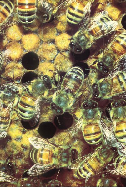 Пчелы взяли такой образ жизни за основу, но развили его до крайней степени и живут многотысячными колониями. Единственная царица-матка находится на сотах и откладывает яйца в ячейки, выстроенные специально для этого рабочими пчелами. Все жители пчелиной колонии, точно так же как термиты, связаны между собой системой химической сигнализации. В улье тоже постоянно циркулируют феромоны, оповещающие его обитателей о плотности населения улья и о наличии или отсутствии в нем матки. Но пчелы пользуются и другими способами общения. Поскольку в поисках пищи они летают по воздуху и не могут оставить своим товарищам пахучий след, им для передачи информации служит танец. Когда рабочая пчела обнаруживает новый медоносный цветок и возвращается после этого в улей, она исполняет на прилетной доске перед летком особый танец. Сначала она, мелко семеня, описывает круг, потом рассекает его пополам, подчеркивая значение второго па нарочитым вилянием брюшка и особо возбужденным жужжанием. Направление секущей точно указывает, в какую сторону надо лететь к источнику пищи. Наблюдающие за танцем другие рабочие пчелы, собравшиеся на фуражировку, немедленно улетают в указанном направлении. А танцорка забирается внутрь улья и там повторяет свой танец. Чем глубже она при этом располагается от входа в улей, тем дальше, стало быть, находится обнаруженный ею цветок. Соты в улье и у диких, и у домашних пчел ставятся вертикально, поэтому теперь вихляющие шажки вестницы не могут показывать направление к источнику пищи. Они теперь соотносятся с солнцем. Если пчела пересекает описанный ею круг вертикально, значит, цветок находится на одной линии с солнцем. Если он, скажем, на 20° правее, пчела протанцует вправо под углом в 20° к вертикали. Окружающие рабочие внимательно следят за ее танцем, запоминают и летят прямо к цветку. Возвратившись с медом, они тоже танцуют, и через короткое время почти вся рабочая сила в улье уже брошена на сбор в новом месте.
