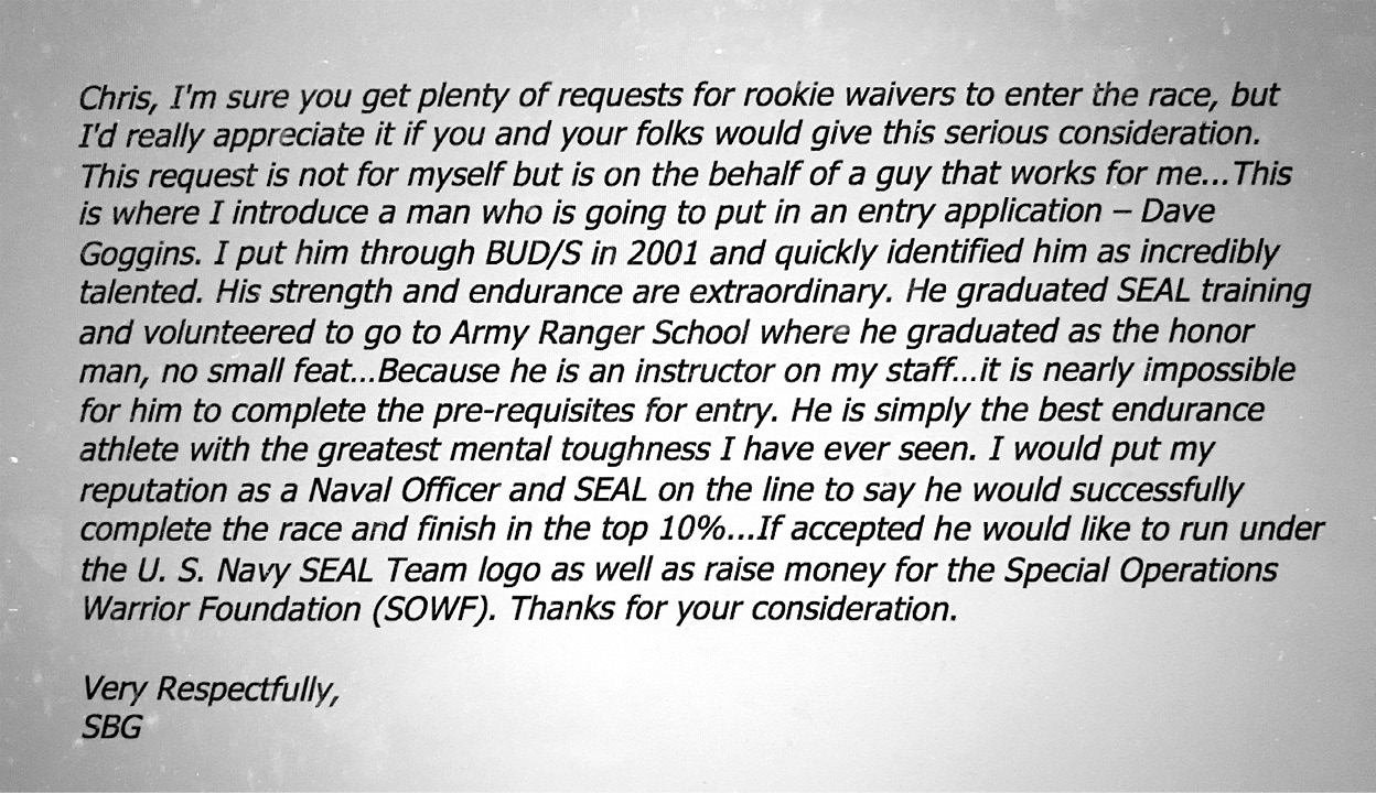 С тех пор как я начал служить в BUD/S, я искал таких людей. Мужчин и женщин с неординарным мышлением. В военных спецоперациях меня удивило то, что некоторые ребята жили так обыденно. Они не пытались напрягаться каждый день своей жизни, а я хотел быть рядом с людьми, которые думают и тренируются неординарно 24 часа в сутки, а не только по зову долга. У этого человека были все причины сидеть дома, но он был готов совершить одну из самых сложных гонок в мире, о чем 99,9 % людей даже не подумали бы, и всего лишь с двумя руками! Для меня он был тем, чем являются ультрагонки, и именно поэтому после Badwater я прикипел к этому миру. Для этого спорта не требовался талант. Все дело в сердце и упорном труде, и он давал неустанный вызов за неустанным вызовом, всегда требуя большего.