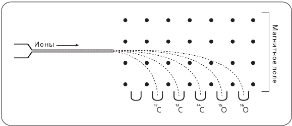 Рис. 8.1. Принцип действия ускорительного масс-спектрометра. Образец испаряется, а его атомы ионизируются, поэтому все они представляют собой положительно заряженные ионы. Ими выстреливают вправо, где они попадают в магнитное поле (оно направлено перпендикулярно странице и представлено маленькими кружками). Заряженные частицы отклоняются магнитным полем, и величина отклонения зависит от массы иона. Таким образом, детекторы для сбора можно размещать на разном расстоянии от источника ионизации и распределять ионы разной массы по детекторам в зависимости от последней