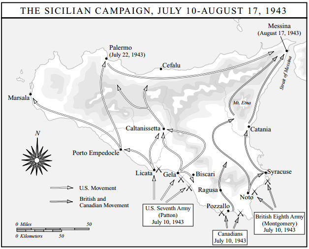 Хотя американцы столкнулись с жестким сопротивлением у Гелы, на южном побережье Сицилии, в других районах высадка прошла практически без сопротивления. Некоторые сицилийцы даже помогали разгружать десантные суда захватчиков. Внутри страны Монтгомери встретил две немецкие дивизии, которые заметно замедлили его продвижение к Мессине. После этого Паттон перехватил инициативу. Заявив, что «если я добьюсь успеха, Аттиле придётся отойти на второй план», он устроил незабываемую демонстрацию мобильности и агрессивности, которые вскоре стали его визитной карточкой. Быстро прорвав слабую итальянскую оппозицию на западе Сицилии, 22 июля он вошёл в Палермо под приветственные крики огромных толп: «Долой Муссолини!» и «Да здравствует Америка!».[957]957