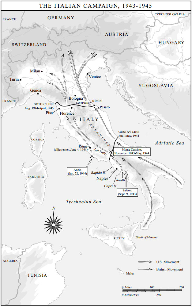 Близкая катастрофа под Салерно стала лишь прелюдией к полуторагодовому испытанию в вытянутом итальянском тупике. Немецкий фельдмаршал Альберт Кессельринг изобретательно воспользовался гористым хребтом итальянского полуострова, изрезанным реками и изрезанным узкими дефиле, чтобы зажать союзников в бутылку без необходимости перебрасывать дополнительные немецкие войска с других фронтов. После организованного отхода с узкой равнины за Салерно Кессельринг укрепил линию («Линия Густава»), которая протянулась от Тирренского моря до Адриатики к северу от Неаполя. Её западный конец был закреплен на аппенинской вершине Монте-Кассино, возвышающейся над слиянием рек Рапидо и Лири и увенчанной великолепным монастырем, основанным Бенедиктом в VI веке, одной из жемчужин европейского благочестия, образования и искусства. Неоднократно разрушенный лангобардами и арабами, восстановленный в XVII веке, Монте-Кассино вновь навлек на себя гнев богов войны, которые мало заботились о христианском боге мира, которому кроткие монахи монастыря воспевали свои ночные вечерни. Монте-Кассино доминировал над входом в долину Лири, одним из немногих водоразделов с севера на юг в Аппенинском хребте, и по этой причине был древним путем в Рим и желанной военной целью.