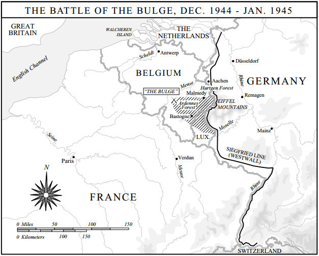 Эйзенхауэр разместил свою постоянно растущую армию в двух больших концентрациях – британцев на севере и американцев на юге, которые пытались пробиться в Рур и Саар. На стыке между британской и американской армиями раскинулся сильно заросший лесом и холмами Арденнский лес, ставший местом начала великой блицкриговской атаки Гитлера на Францию в 1940 году. Словно забыв об этой истории, Эйзенхауэр решил, что Арденны слишком густо заросли и ограничены для массированной атаки союзников или для немецкой контратаки. Поэтому он разместил всего четыре американские дивизии для удержания фронта перед Арденнами.