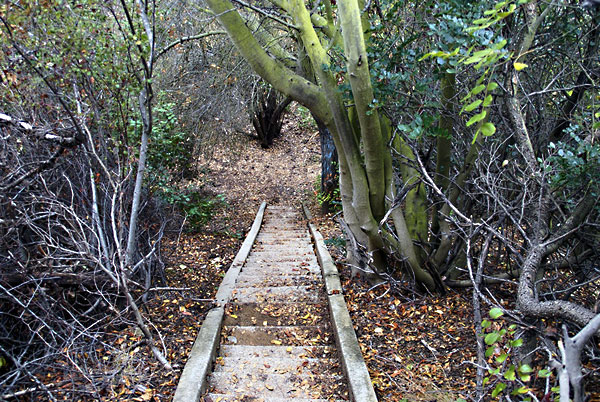Если знаете где искать, то обнаружите узкую лестницу из бетона, к которой можно подойти с пожарной просеки. Эта лестница спускается вниз ко дну каньона, и это очень, очень долгий спуск. Пятьсот двенадцать ступенек, чтобы быть точным. Пока спускаетесь, эта лестница, которая, похоже, никогда не закончится, кажется здесь жутко неуместной. Во время спуска, имея свободное время, можно задуматься (на самом деле большинство людей, вероятно, не будет, но я подумал), сколько человеко-часов потребовалось, чтобы установить опалубку для 512 залитых бетоном ступенек, и как груз бетона выливали здесь, посреди дикой природы.