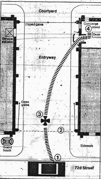 Мистер Леннон и Йоко Оно вышли из своего автомобиля (1), в то время как убийца (2) ждал внутри арки. Когда они прошли (3), он выстрелил. Мистер Леннон ввалился в помещение (4), где он упал, смертельно раненый.