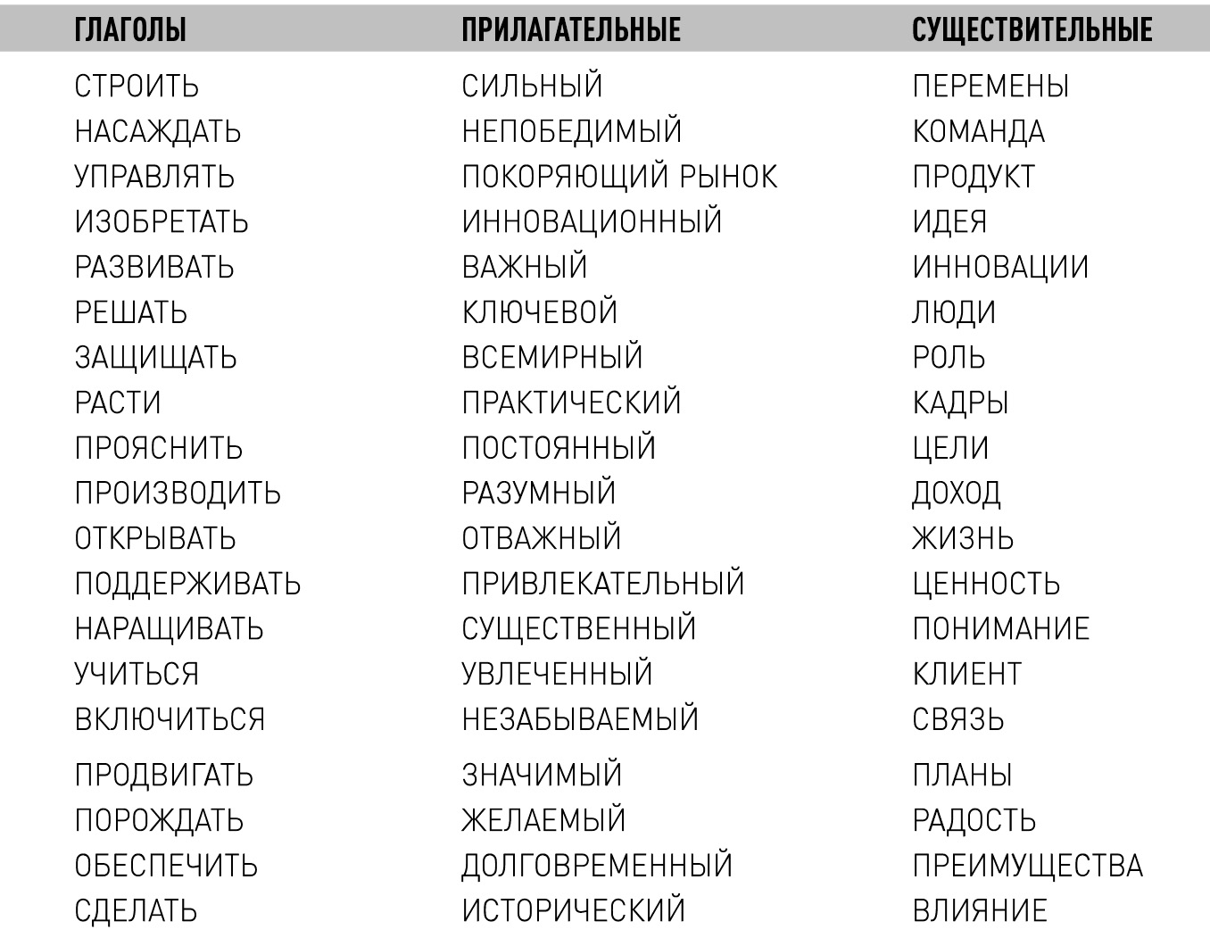 Если вы остановились и не продвигаетесь, вот вам список самых подходящих для бизнеса глаголов вместе с существительными, которые вы могли бы добавить к ним – да чего там, берите для украшения и прилагательные.