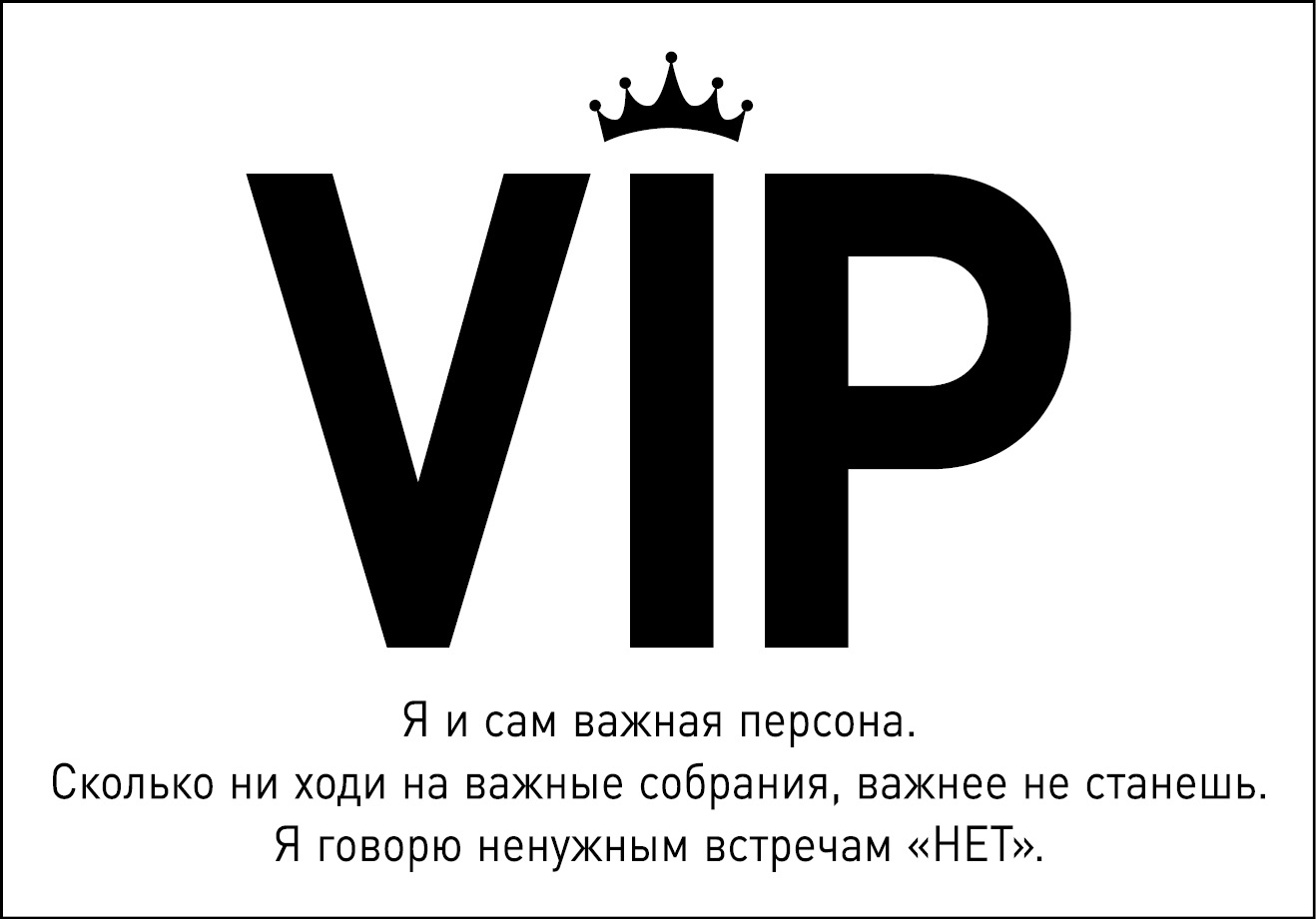 И, кстати говоря, «не тем» человеком можете оказаться ВЫНастала пора заглянуть в зеркало. На сколько встреч вы соглашались прийти только потому, что это льстило вашему самомнению, в особенности если там появлялись «важные персоны»? Хотя мои клиенты постоянно жалуются на потерю времени из-за ненужных собраний, довольно часто я улавливаю в их жалобном тоне нотки самодовольства и «значительности».