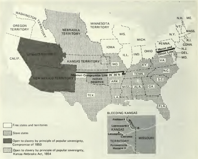 В 1849 году Дуглас заявил, что Миссурийский компромисс «канонизирован в сердцах американского народа как святыня, которую ни одна безжалостная рука никогда не будет настолько безрассудна, чтобы нарушить». Речь в Спрингфилде, 23 октября 1849 г., цитируется по John G. Nicolay and John Hay, Abraham Lincoln: A History (10 vols.; New York, 1890), I, 335; заявление Атчисона в Congressional Globe, 32 Cong., 2 sess., pp. 1111, 1113.