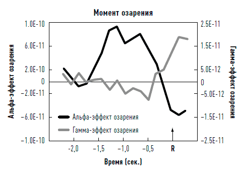 Вот график от Бимана. Первый пик на более темной линии представляет собой всплеск альфа-ритма; мозг успокаивается. Второй пик в гамма-диапазоне возникает непосредственно в момент озарения.