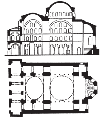 Церковь Святой Ирины – свидетельство дальнейшего расцвета новых архитектурных идей. В плане этот храм сохраняет старинную трехнефную базилику, но над более широким средним нефом возвышается огромный купол. К западу от него располагается второй купол, несколько меньшего размера. Оба опираются на массивные кирпичные столбы, заменяющие часть колонн обычной трехнефной базилики. Сама эта идея перемежать три-четыре колонны мощными столбами уже была испробована на Востоке в базиликах с деревянной крышей, таких, например, как церковь Святого Димитрия в Фессалонике. Назначением такого приема было повышение устойчивости здания к землетрясениям, случающимся в этой местности. Таким образом, архитектор церкви Святой Ирины соединил в ней план, наиболее отвечавший требованиям христианской веры (большое пространство для молящихся и достойного проведения литургий), с формой кровли, придающей зданию духовную возвышенность, внушающей верующим образ свода небесного, то есть соответствующей требованиям эзотерической мысли Византии.
