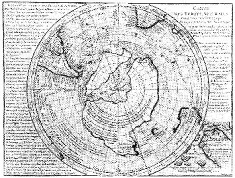 Другим составителем карт, продемонстрировавшим знание источников, был Филипп Буаше, французский картограф восемнадцатого века. Его карта 1737 года демонстрирует версию Антарктиды того времени, когда она была совершенно свободна ото льда! Как мы видим, в середине южного континента он изобразил водное пространство, делящее континент на два субконтинента, один больший, другой меньший; возможно один в пять раз больше, чем другой.
