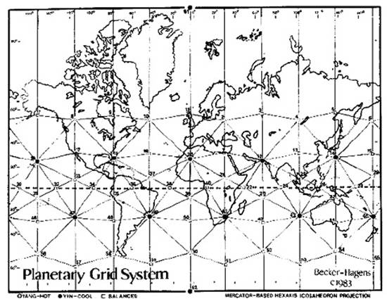 Приведенная выше Система Планетарной Решетки перепечатывается из оригинальной статьи Кристофера Берда “Планетарная Решетка ”, опубликованной в 5-м номере журнала Новая Эра, май 1975 год, стр. 36–41. Гексакисикосаэдральная решетка, вычисления координат и система классификации точек – оригинальное исследование Элизабет Хэгенс и Уильяма С. Бэкера. Материалы распространялись с разрешения авторов Международной Безопасной Технологии в содружестве с Университетом Гавернорс, Отделом Межкультурных Учений (Universiry Park, Illinois 60466: tel. (312) 534-5000, ext. 2455) Карта может перепечатываться, если распространяется бесплатно, и с уведомлением Университета Гавернорс и господина Берда.