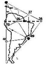 “Проявление погребенного фокуса” центрировано в алмазе, сформированном точками 18, 35, 37 и 49. На вышеприведенных рисунках мы уже видели “мерзкий вихрь” Африки, формирующий такое же большое “проявление погребенного фокуса”. Смещение суши Южной Америки от точного вписывания в “алмаз” может быть отнесено на счет отталкивания Средне-Атлантического Хребта, с потрясающей точностью следующего линиям Глобальной Решетки. Возвращаясь к карте Бэкера/Хэгенс: легко видеть, как линия четко разграничивает разделение между континентами, ибо Средне-Атлантический Хребет является точкой расширения между двумя континентальными плитами.
