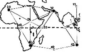 Также мы видим, что узловая точка 22 мягко толкает восточное побережье Африки, вынуждая его изгибаться внутрь и образовывать Сомалийскую маленькую бухту. Можно предположить, что “трещины”, разделяющие Африку и Саудовскую Аравию вызваны расширением Решетки, вытягивающим сушу в этом же направлении. “Трещина” слева от точки 12 точно следует линии решетки. И, наконец, четко видно, что треугольник с направленной вверх вершиной заканчивается сушей, которая со стороны Африки определяется как левая сторона, а со стороны Индии – правая.