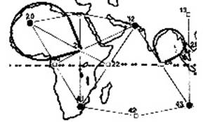 Треугольник с вершиной вниз хорошо описывает Африку, и избыток суши на западном побережье объясняется давлением Средне-Атлантического Хребта; линия решетки Атлантики формируется точками 10, 19, 37, 38, 39 и 50. Восточное побережье Африки точно следует восточной стороне треугольника на линии решетки от точки 41 до точки 42.