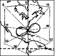 И вновь мы видим дугообразный “диамагнитный энергетический вихрь”, формирующий землю в виде плавной кривой. Аналогичное изогнутое образование создается восточным побережьем Индии и западным побережьем района Китая/Кореи/Вьетнама в Азии. Вихрь сбалансирован между точками 24 и 13.