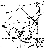 Итак, можно убедиться: если мы знаем, что искать, и имеем карту Решетки, такие образования не смогут ускользнуть от нашего внимания. На рисунке 1, для сравнения, у нас есть карта решетки Китая. На рисунке 2 имеются три круглых вихря. Мы уже обсуждали нижний левый вихрь в Индии и Китае. Центральный вихрь формирует Восточное побережье Китая, возникая и излучаясь из точки 13. Самый верхний и самый большой вихрь формирует всю Японию и русский архипелаг, он центрируется и излучается из точки 4.