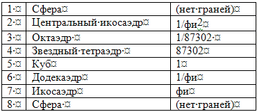 Таблица II. Гармонические соотношения Платоновых Тел.