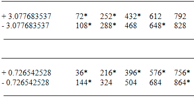 Карл усмотрел, что числа частот Гематрии требуют определенной логики, поэтому он разместил их в две отдельные шкалы, организуя числа по их тангенсам, помечая числа, пришедшие из древних систем, звездочками и заполняя “пробелы” подходящими числами. Получилось нечто, похожее на: