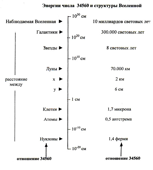 Итак, все мы знаем, что материя представляет собой атомную энергию, на 99,99999 процентов являющуюся пустым пространством. И даже оставшиеся 0,00001 процента тоже не твердые, а возникают из эфирной “энергии нулевой точки” сознания. Тогда, понимая гармонику, мы видим, что атом – это выражение цвета, звука и геометрической вибрации. Это могло бы объяснить, почему теоретический предел Периодической Таблицы Элементов – 144, гармоника света. И рассматривая всю Солнечную Систему как гигантскую Единицу Сознания, мы обнаруживаем, что числа очень гармоничны и просты. Также, следует напомнить о существовании Закона Боде, демонстрирующего, что расстояние между планетами прямо соответствует музыкальным соотношениям. Такое положение было гармонически подтверждено и переопределено работой Рэя Тоумса и Дж. Б. Стоункинга, которые в своей книге уделяют внимание вышеуказанной статье в газете ЛондонГардиан. Кроме того, Тоумс показывает, что каждый системный уровень размера во Вселенной отделен от другого равным соотношением. Гармонические вибрации числа 34560 приняты в качестве соотношения, точно разделяющего средний размер величины объектов, что видно из нижеприведенной иллюстрации Тоумса. Эта величина и другие положения, касающиеся гармонической структуры, будут рассмотрены подробнее в книге Сближение: Физика Вознесения.