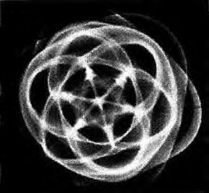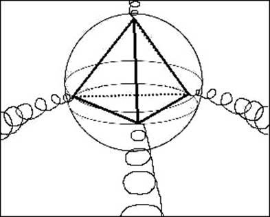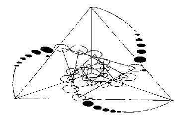 Уже следует узнать нижеприведенный рисунок, извлеченный из хорошо известного образования круга на полях “Тройная Серия Юлии”, появившегося буквально за одну ночь в Виндмилл Хилле в Англии в 1997 году, ибо мы уже приводили его в этой книге. Правда, на том изображении он был в круге, чтобы продемонстрировать его внешнее сферическое поле. Этот рисунок помогает визуализировать, как такая спираль, основанная на фрактале Серии Юлии, будет формировать тетраэдр. На само м образовании не было прямых линий и треугольников, они пририсованы позже и выровнены с формой, которую предполагает набор спиралевидных кругов. Более того, если в этот рисунок мы также вставим перевернутое зеркальное отображение образования круга на полях, то увидим формирование эллипсов, идентичных наблюдаемым Коуэном и визуально смоделированных в экспериментах Киматики д-ра Дженни.