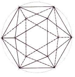 Как мы только что сказали, Пуруша также демонстрирует первую форму, кристаллизующуюся в сфере, когда мы находимся в начале спектра. Следовательно, Одно, будучи проявлением всех сознательных сущностей, должно выкристаллизовываться в мире форм как Пуруша; и любая сущность должна снова достичь уровня Пуруши, чтобы вернуться к Одному в конце цикла. Нижеследующий рисунок из Сакральнойгеометрии Лолора показывает, как вы можете нарисовать двумерный икосаэдр, используя циркуль и линейку.