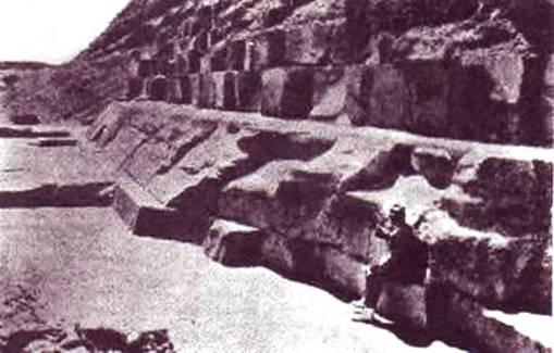 Хотя сейчас мы не можем видеть пирамиду как кристалл, в египтологических кругах это хорошо известный факт: когда пирамида была построена, снаружи ее полностью покрывала облицовка. Облицовка была сделана из белого туранского известняка, отполированного до зеркального блеска (Лемесурье, 1977). Днем пирамида сияла так ярко, что ослепляла; отсюда древние египтяне называли ее “Та Кут” или “Свет”. Смотря на эту оригинальную форму, очень легко прийти к выводу, что ее построили не примитивные человеческие существа. На рисунке мы видим остатки этих камней, еще сохранившиеся у основания пирамиды.