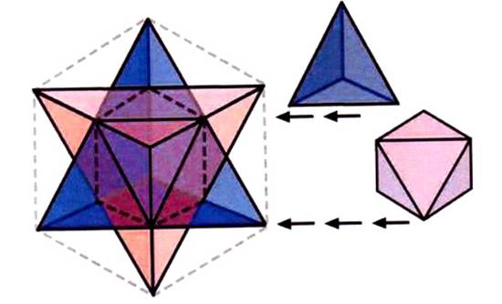 Каждая грань октаэдра, имеющая форму равностороннего треугольника (все внутренние углы по 60 градусов и все стороны одинаковой длины), становится одной трехгранной вершиной звездного тетраэдра. Поскольку у октаэдра восемь граней, вам понадобится прибавить к его граням восемь тетраэдров. Чтобы оживить это приращение в виде комикса: могло бы показаться, что октаэдр вдруг расцветает как цветок; пока тетраэдры занимают каждый свое место, грани вдруг растут вверх. [Сравните приведенный здесь рисунок с гармонической таблицей. Это поможет визуализации. На рисунке верхняя форма справа демонстрирует, где должен был бы находиться один из восьми тетраэдров, если бы не был напрямую прикреплен к октаэдру.]