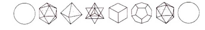 Далее, если вы поставите точку в центре каждого пятиугольника додекаэдра и соедините все полученные точки, то будете иметь набор линий, образующих пятиугольную звезду, создающую форму икосаэдра – последнего главного узла перед возвращением к Сфере. Короче говоря, возвращаясь к изначальной таблице гармоник, мы можем видеть, что все движение представляет собой сферу, или Единство, расширяющееся в “семя” или фундаментальную форму икосаэдра. По своей форме эта структура позволяет появление всех других, содержащихся в ней форм (Лолор, 1982). Именно из-за аспекта семени икосаэдра Индусы ассоциировали его с мужским богом. Они воспользовались метафорой семени или “семени жизни”.
