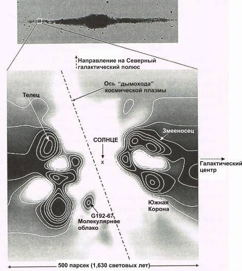 “Когда мы приступили к созданию карты межзвёздного газа в нашей Галактике, мы обнаружили, что располагаемся в сферической полости, возможно, заполненной горячим, ионизированным газом, – говорит Уэлш. – Однако “локальный пузырь” по форме больше напоминает трубу, так что его стоило бы назвать скорее “локальным дымоходом”. “Эта тонкая оболочка плотного газа, окружающая местную полость, пробита в нескольких местах, – говорит доктор Франсуа Крифо, астроном из Парижской обсерватории. – По нескольким направлениям наша полость, по-видимому, соединена туннелями горячего разрежённого газа с другими подобными регионами”. Надо сказать, что сеть таких “туннелей” раскалённого газа была предсказана ещё тридцать лет назад сотрудниками Университета штата Висконсин Доном Коксом и Барри Смитом”.[180]