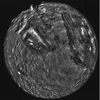 Спутник Урана Миранда имеет гигантское, очень необычное геометрическое образование в форме буквы L на стороне, обращенной лицом к пролетавшему мимо зонду НАСА, а также огромной пятиугольной формой на обратной стороне. L-образная форма была представлена Захарией Ситчиным как признак искусственной структуры в книге Назад в будущее.[210] В 2014 года НАСА объявило об обнаружении на Миранде трех геометрических структур, которые назвали “коронами”. Согласно Чарльзу Чои с сайта Space.com: “Миранда похожа на чудовище Франкенштейна – странная путаница частей, не соединенных надлежащим образом”.[211]