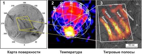 Квадратный тепловой паттерн на спутнике Сатурна Энцеладе.