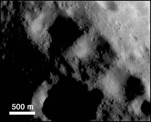 Имеется всего 5 квадратных кратеров, которые, по мнению ученого НАСА, “рассказывают нам о чем-то очень интересном”. Верхние два кратера одинакового размера, но слегка смещены друг от друга, возможно, из-за внутренней структуры астероида. Еще один чуть больший квадратный кратер находится под ними. Справа от этого кратера располагается еще один кратер, он вполовину меньше, но все еще сохраняет квадратную форму. В общем и целом, все выглядит как разрушенные прямоугольные углубления, которые мы видим рядом с Blair Cuspids – гигантскими кристаллическими обелисками на Луне.