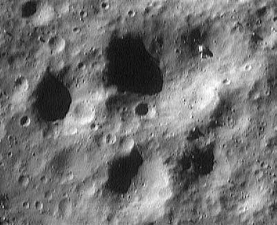 Еще одно изображение Эроса, намного более вызывающее. И вновь, мы видим группу кратеров, имеющих квадратную форму. В середине располагается больший кратер, а более мелкие кратеры находятся слева, справа и ниже.